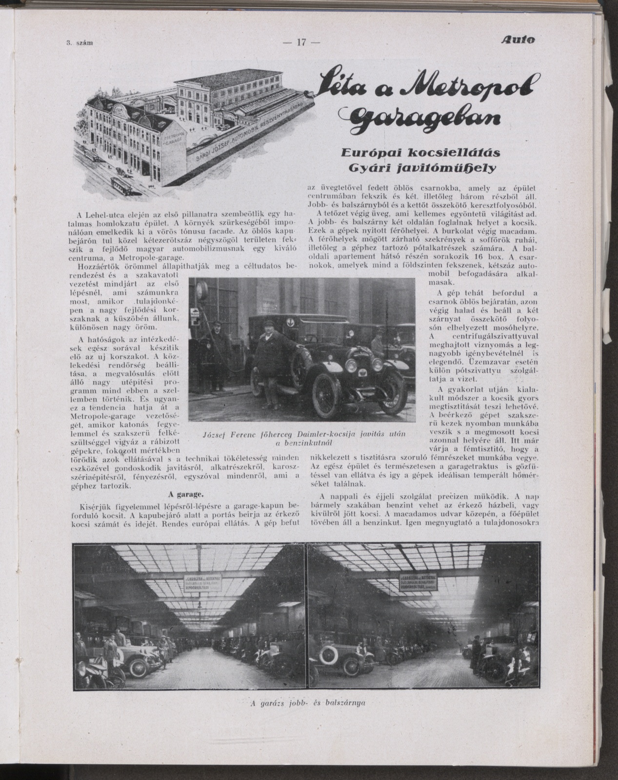 A kétemeletes műhelyépület, bár az udvarban áll. homlokzatának kivitele folytán bármely nagyvárosi utcához is méltó külsővel bír. A hatalmas ablakok minden oldalon bőséges világosságot bíztosítanak és födémei ugy vannak tervezve, hogy a legnehezebb műhelymegterhelést is elbírják. Az épület emeleteire elől és hátul egy-egy lépcső vezet, ezenkivül pedig a járművek részére a garageból teherfelvonó viszi fel, mely a legnagyobb járművek befogadására is alkalmas. Kisebb tárgyak számára külön teherfelvonó szolgál.