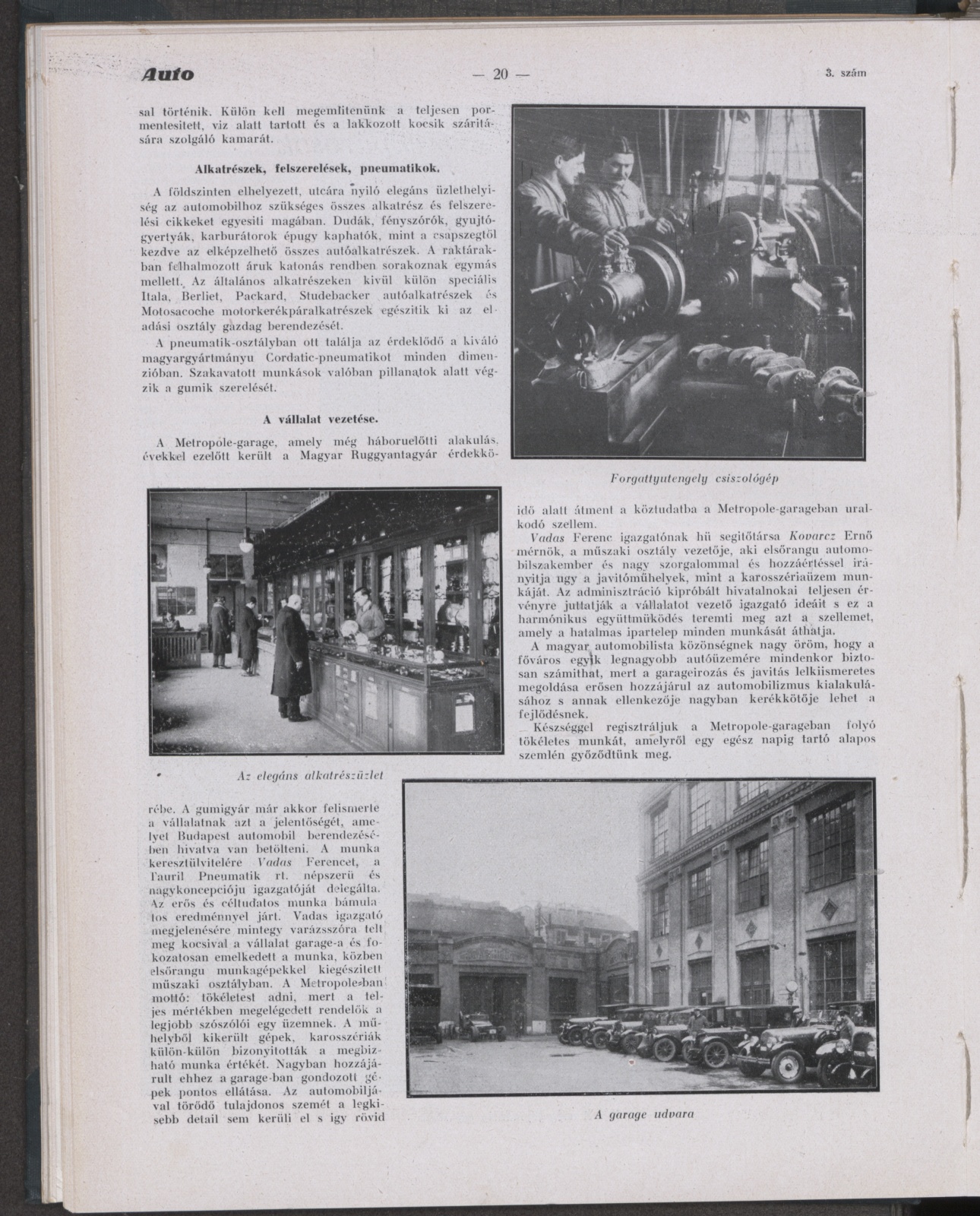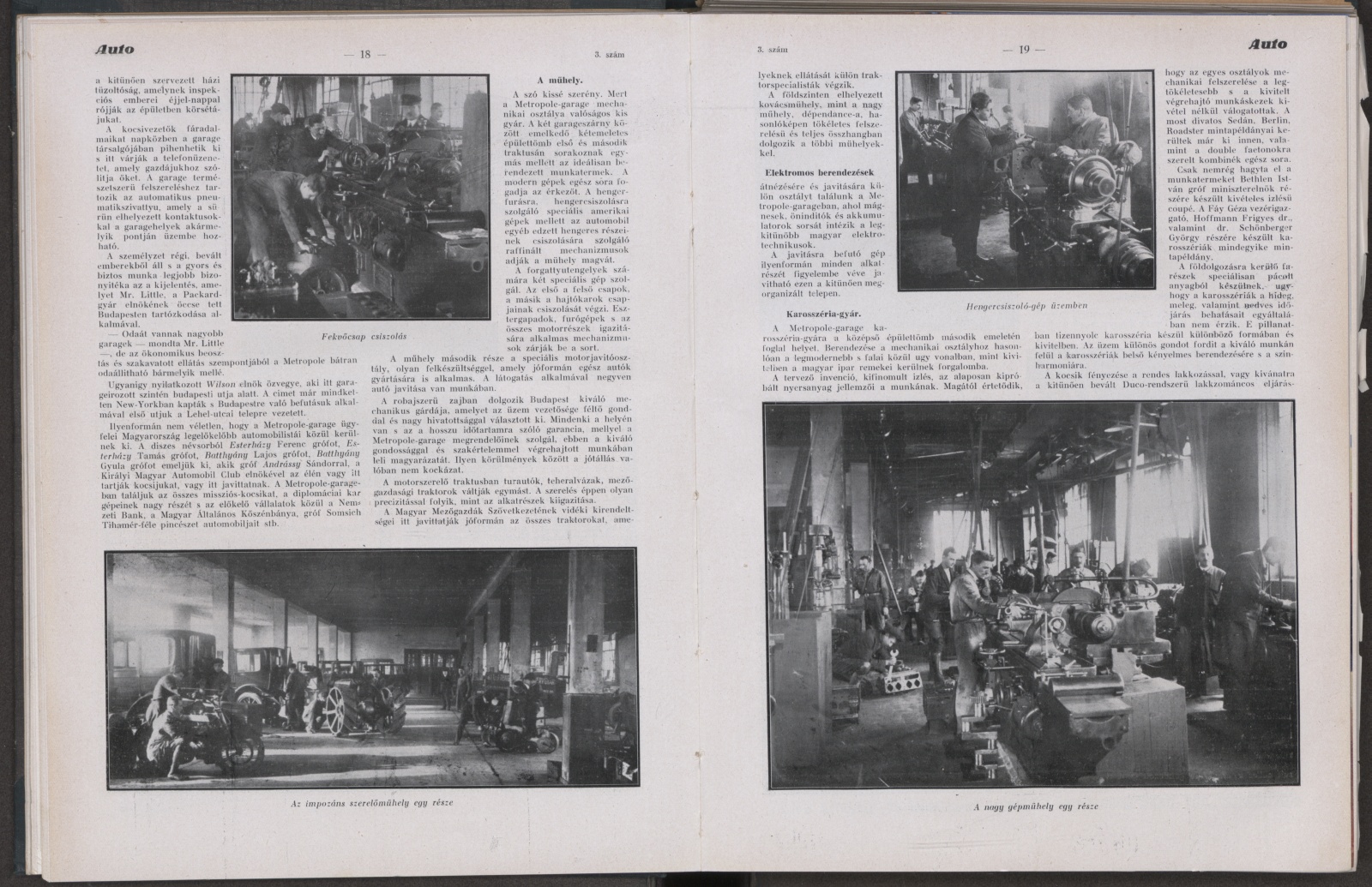 Az épület I. emeletén vannak a vasmegmunkáló szerszámgépek, II.emeleten pedig a famegmunkáló gépek, valamint a bognár – és egyéb karosszéria-munkákhoz szükséges gépek, végül a galvanizáó berendezés. Ez az épület is bőségesen el van látva mellékhelyiségekkel és ezek a munkáshygiénia legmodernebb követelményeinek megfelelően vannak kiképezve. A mellékhelyiségek e műhelyéületben is csempézve vannak. A villanyvilágítási berendezés minden igénynek megfelel. Az egész épületben központi fűtés van és ezenkivül a fényezőműhelyben speciális kályha. Itt van elhelyezve az uj Duco fényező-berendezés is. Ez a helyiség külön ventilációval bír”.