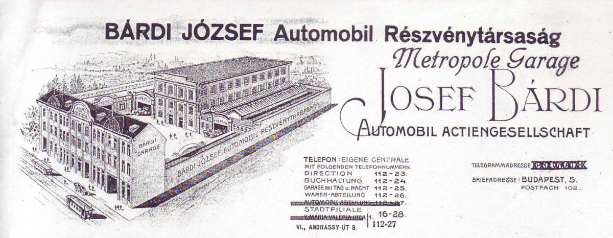 Bárdi József, aki korábban a Magyar Ruggyantaárugyárban dolgozott 1896 körül nyitotta meg kerékpár-alkatrészekkel foglalkozó boltját. Később bővítette profilját, autóalkatrészeket, majd komplett gépkocsikat is árusított. Ő lett a Mercedes helyi képviselője. Ezt követően osztrák banksegítséggel létrejött a Bárdi József Automobil Rt, amelynek 1913-ban készült el főhadiszállása a VI. kerület Lehel u 25 alatt.