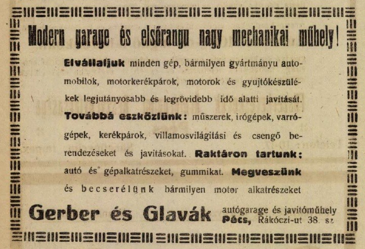 „E sorok írója Pécsett járván, a véletlen egy ottani műszerészműhelybe vezette, ahol egy „házilag készült” favázas, léghűtéses motorú kis autót látott. Közelebbről megtekintve, érdekesen eredeti szerkezetű kis gázosító keltette fel figyelmét, amelyről a műhely tulajdonosa, Glavák műszerész, azt a felvilágosítást adta, hogy ő azt inaskorában ezelőtt 15 esztendővel szerkesztette és sajátkezüleg készítette el: azóta is kitűnően működik. A dologban az az érdekes, hogy a motor szívóhatása által mozgatott szabályozó dugattyú elvén alapszik, amelyre csak a legutóbbi években jutottak a konstruktőrők és a legmodernebb és leggazdaságosabb gázosítókat ma már ezen elv alapján szerkesztik. Egy újabb példa, hogyan lesz semmivé a magyar elme találmánya pártfogás, érdeklődés híján”
