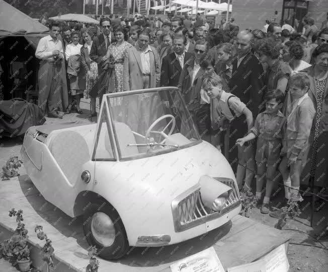 „Budapest, 1957. június 2. Sok a csodálója Karika István kisiparos törpeautójának, a Budapesti Ipari Vásáron a Városligetben. MTI Fotó: Fényes Tamás”.
