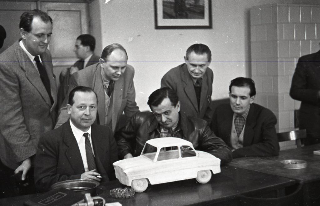Törpeautó-értekezlet valamikor 1956-ban (?) Bal szélen Zappel József, aki a Székesfehérvári Motorjavító Vállalatnál felelt a projektért. Ülnek (balról jobbra) Jurek Aurél, Wohlmuth Emil és talán Horváth József. Forrás: Magyar Műszaki és Közlekedési Múzeum, Autó-Motor/Rózsa György Archívum, MMKM_TEMGY_2025_2_1_I_12574