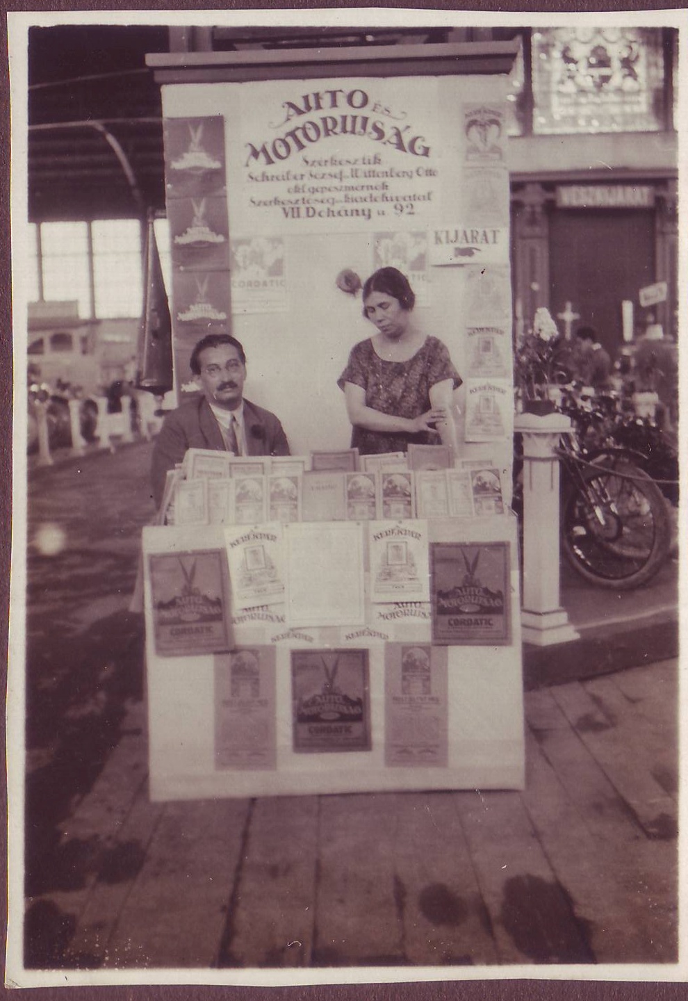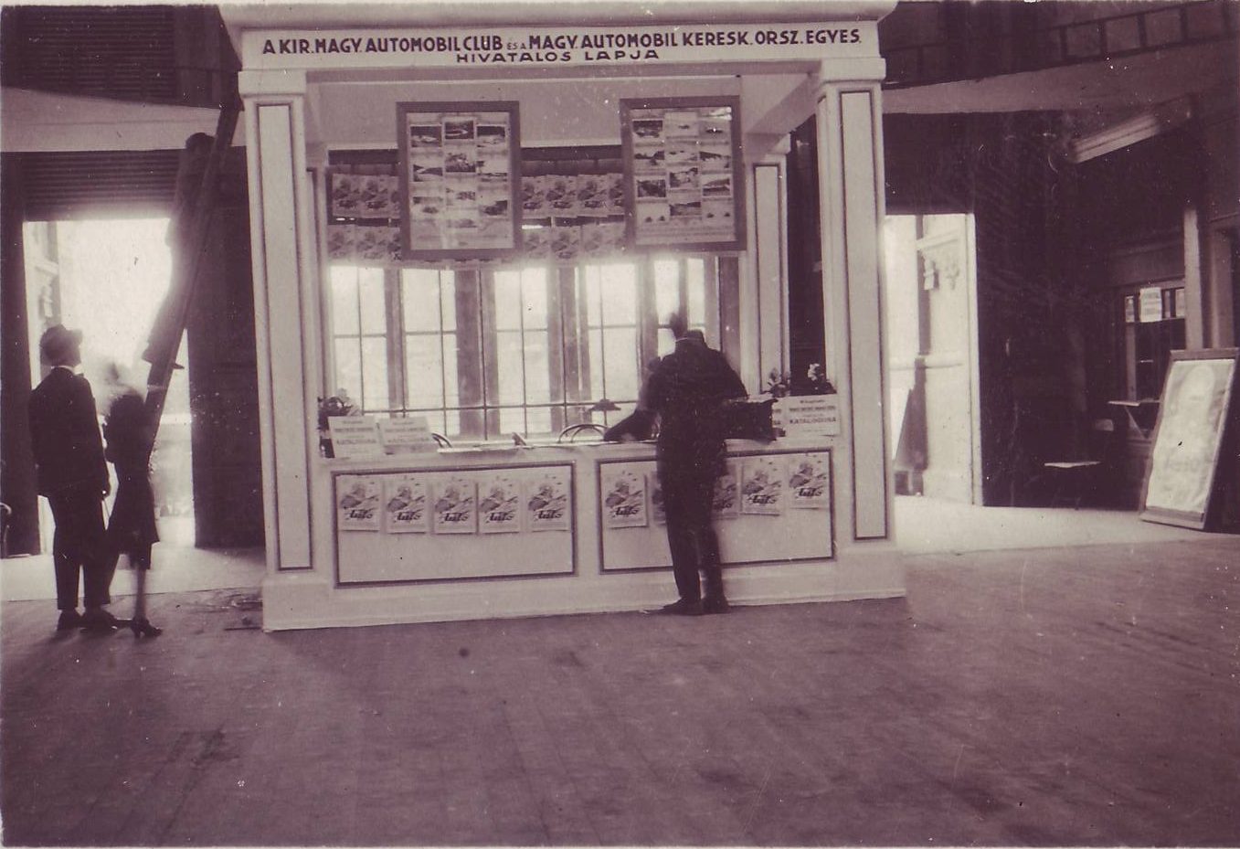 Az Autó című lap standja. „Az izlésesen szervírozott standon, amely szintén Lakatos Arthur iparművész tervei szerint készült, a lap kiadványai kaphatók, azonkívül sorsjegy a június harmadiki automobilsorsolásra.Forrás: Schüller László / Holló Krisztina
