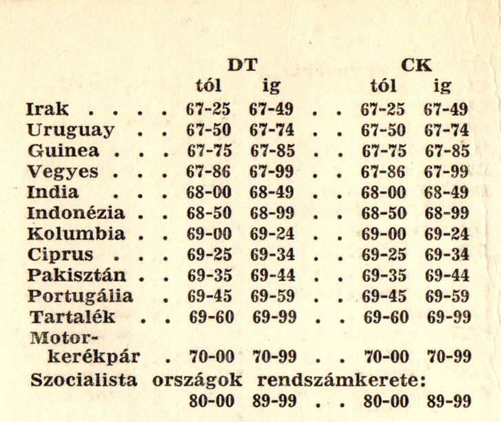 - A CK (külképviseletek részére szolgálati útlevéllel) és a DT (külképviseletek részére diplomáciai útlevéllel) rendszámokhoz külön keretek tartoztak – lásd fentebb.